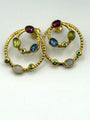 Double hoops made of 18k gold and adorned with rubies, sapphires, tourmalines, pearls and a variety of semi-precious stones.