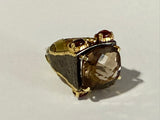 Experience the stunning brilliance of the center cut topaz stone, framed by a square setting adorned with rich ruby and garnet stones. Complemented by vibrant green tourmaline accents, this exquisite piece will elevate your distinguished ensemble. Ring size 7 - R118