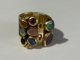 Top Split Semi-Precious Band - If you love a band ring, you are going to love this one! It has an amzing open split design on the top to enhance the semi-precious stones that are scattered to one side of the two larger amethyst and green tourmaline tear drop shaped stones on the other. Custom design that screams of creativity and elegance! Ring size 9 - R129